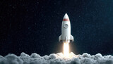 Rocket launches into space from cloud base under starry night sky, symbolizing innovation and exploration