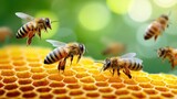 Honeybees On Honeycomb With Green Bokeh Background Bees Collecting Nectar Apiculture And Beekeeping Honey Production And Pollination