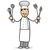 Cartoon Koch mit Kochmütze hält Küchenhelfer