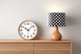 Interior Scene With Wooden Clock And Table Lamp With Polka Dots On Wooden Cabinet Against Gray Wall In Minimalist