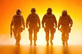 Four soldiers in full gear walk forward in a dramatic orange glow, showcasing teamwork and readiness