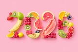 Creative Number Design Made Of Fresh Fruits On Pink Background Healthy Eating Concept For New Year Celebration