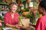 Junge Floristin und Senior Gärtnerin tragen Geranien