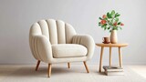 Cozy Armchair With Flowers On Table In Interior Setting Beige Tones Modern Home Decor Minimalist Design Comfortable Furniture And Relaxing Atmosphere