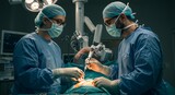 Witness the pinnacle of professional pet surgery in action A dedicated veterinarian and their skilled assistant meticulously perform surgery on a beloved dog within a sterile operating room, ensuring