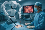 Surgeons perform surgery using robot in modern operation room. Robotic arm precise movements in operation. Medical tech, innovative healthcare procedure, futuristic technology used during surgical