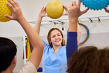 Pediatric Physiotherapy Session: Therapist Guiding Children in Rehabilitation Exercises with Therapy Balls, Focus on Motor Skills and Balance Training, Pediatric Rehab Center