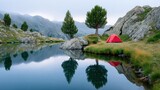 Alpine lake campsite with red tent beside rocks and tall trees reflecting in calm water