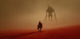 Fantasy scene with a horse rider facing a giant robot in a foggy desert landscape cinematic concept art science fiction illustration