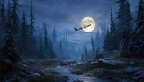 Santa's sleigh flying across a moonlit forest on a winter night