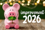 Pink Piggy Bank Holding Clovers With Improvement Text On Wooden Surface And Bokeh Lights Background For Luck And Financial Goals