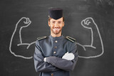 Freundlicher Page in Uniform mit Muskelarmen als Service Konzept