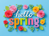 Hello Spring Floral Design With Colorful Paper Cut Letters Roses And Green Leaves On Light Blue Background For Seasonal Greetings