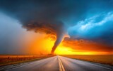 Dramatic Tornado Over Road At Sunset Stormy Weather And Natural Disaster Concept Meteorology