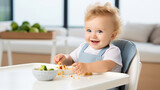 Happy toddler enjoying meal in highchair at home with smiling face