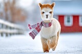 Cute alpaca wearing a red and white scarf trots through snowy field near a red barn in winter