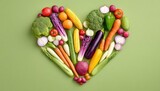 Heart-shaped arrangement of fresh vegetables on green background symbolizing healthy lifestyle