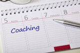 A calendar planner with the word 'Coaching' written and a pen nearby