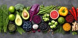 Assortment Of Fresh Vegetables And Fruits On Dark Background For Healthy Eating And Dieting Concepts Includin