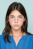 Passport ID photo of young Spanish woman with blue attire and light background