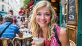 Smiling blonde woman enjoys iced coffee at outdoor street cafe in sunny city