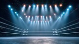 Illuminated boxing ring with bright spotlights in a large arena during a live sport event