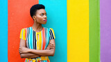 Colorful portrait of a thoughtful woman against a vibrant striped wall