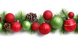 Christmas Garland With Red And Green Baubles And Pine Cones On White Background For Holiday Decorations And Festive Designs