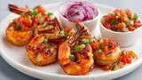 Grilled Shrimp With Tomato Salsa And Red Onion On White Plate Seafood Appetizer Healthy Food Gourmet Cuisine