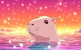White capybara swims in pink sunset sea, gazing up at warm orange sky
