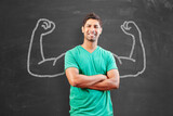 Mann als stolzer Student oder junger Lehrer vor Tafel mit Muskel Armen