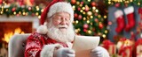 Santa Claus Reading A Letter In A Cozy Christmas Setting With Tree Gifts And Fireplace Holiday Season Concept