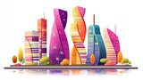 Colorful Cityscape Illustration With Modern Buildings Trees and Water Reflections on White Background for Urban Planning and Design Projects