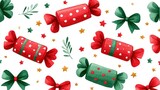 Festive Seamless Pattern With Watercolor Candy Bows And Stars On White Background For Christmas And Holiday Designs