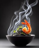 Glistening squid ink pasta with shrimp, steam rising, and greens in a dark bowl for a premium looking dish