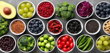 Assortment Of Colorful Healthy Food Ingredients In Bowls On Gray Background For Nutrition And Diet Concepts And Culinary Applications