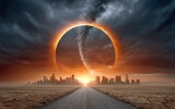 Apocalyptic Cityscape With Fiery Ring And Stormy Sky Road Leading To Destruction End Of The World Concept
