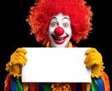 Clown With Red Wig Holding Blank White Sign On Black Background For Circus Or Party Advertisement And Entertainment