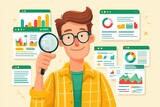 Man with magnifying glass examining charts and dashboards for data analysis concept in a business setting