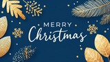Christmas Card Design With Golden Leaves Snowflakes And Pine Branches On Blue Background For Holiday Season Greetings And Celebrations