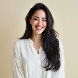 Portrait of a smiling middle-aged woman with jet-black hair, exuding confidence and warmth in a natural setting