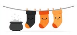 Smiling Halloween socks and cauldron with cute expressions on a clothesline