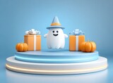 Cute ghost figure in witch hat with pumpkins and gifts on decorated podium