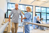 Elderly rehabilitation therapy session with professional support in a modern facility