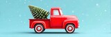 Red vintage truck carrying a Christmas tree on a snowy blue background