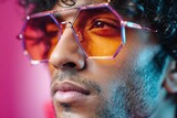 Portrait of man in geometric sunglasses with vibrant colors and style