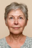 Front-facing photo ID portrait of a mature Czech woman with gray hair