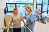 Senior woman receiving physical therapy from caregiver in a rehabilitation facility