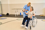 Elderly Woman in Wheelchair Doing Rehabilitation with Caregiver Assistance