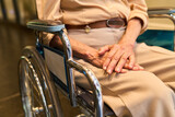 Senior individual sitting in wheelchair with hands folded in a serene setting